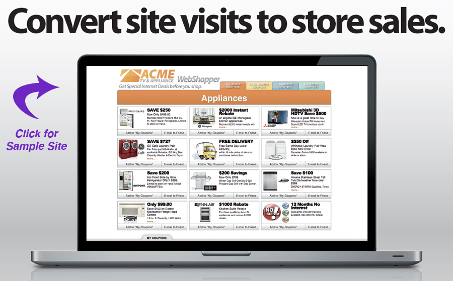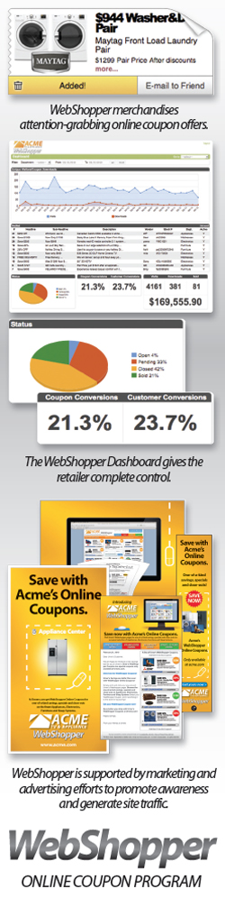 WebShopper Online Coupons deliver new customers and site-to-store sales. The WebShopper Online Coupon Program offers retailers a cost-effective way to capture e-commerce site-to-store sales with popular, user-friendly coupons. WebShopper is easy to install, easy to manage, and can be integrated with other store management systems. By using WebShopper, retailers can: